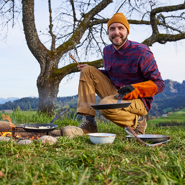 Klassiker für das Outdoor-Kochen sind Lagerfeuer, Campingkocher und Grill. Wenn etwas mehr mitgenommen werden kann, als in einen Wanderrucksack passt, empfiehlt Dave einige grundlegende Utensilien. «Messer, Schneidebrett und ein Kochset sind unverzichtbar.» Für die Feuerküche ist als zusätzliche Ausrüstung ein Pfannenknecht, den man auf das Feuer stellt und der dann wie ein Herd funktioniert, praktisch. Für die grosse Runde kann man einen sogenannten Pfaditopf draufstellen und zum Beispiel ein Chili zubereiten. Besonders angetan hat es Dave auch ein mobiler Backofen, mit dem er über dem Feuer Brot und Kuchen backen kann.