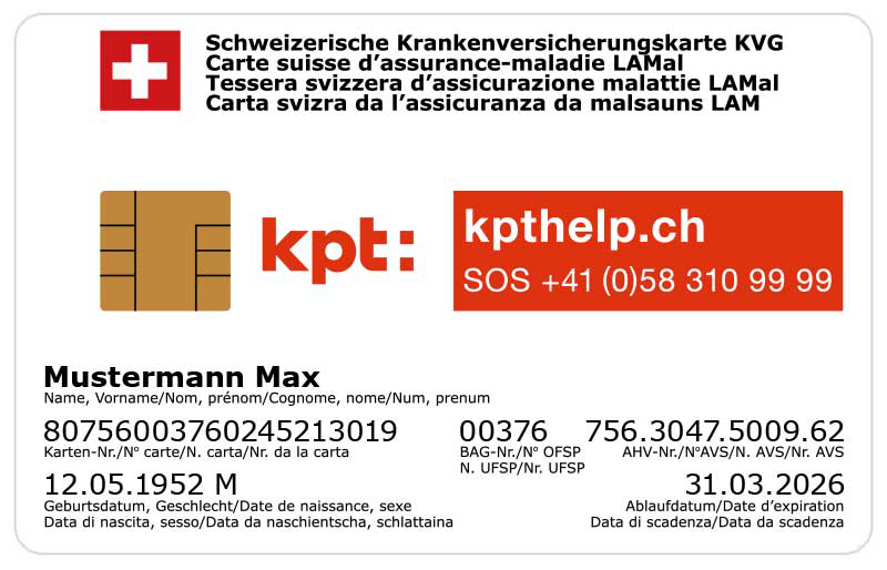 Die Versichertenkarte identifiziert Sie gegenüber den Leistungserbringern wie Ärztin, Arzt, Spital oder Apotheke im In- und Ausland als grundversicherte KPT-Kundin oder KPT-Kunde.