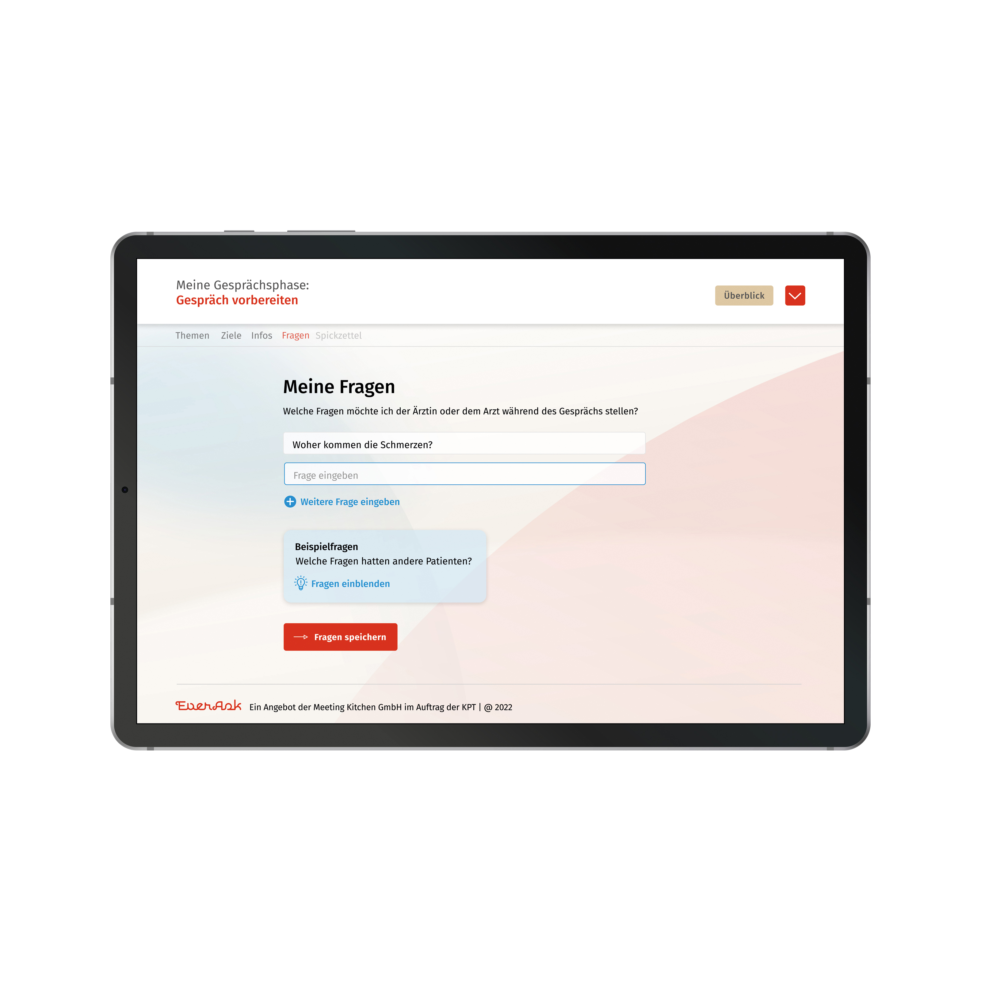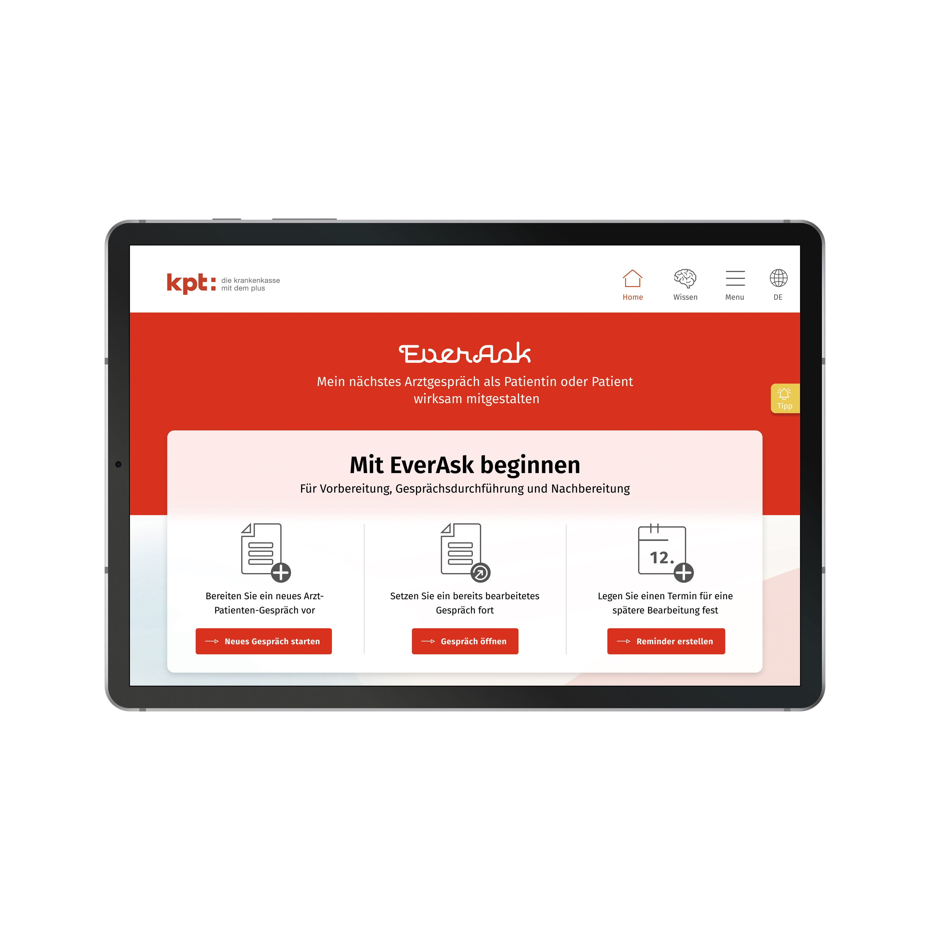 Das Universitätsspital Basel hat von dem Start-up Meeting Kitchen den ersten Prototypen einer sehr ähnlichen Web-Applikation entwickeln lassen und ihn anschliessend getestet: Die Patientinnen und Patienten konnten dabei vom Spitalbett aus über ein Tablet Fragen zum Behandlungsablauf formulieren und vorab für das Behandlungsteam hinterlegen. Auch in Anbetracht der guten Erfahrungen am Universitätsspital Basel hat die KPT Meeting Kitchen beauftragt, eine neue, in ihren Funktionen wesentlich erweiterte Version dieser Applikation zu entwickeln: den Online-Service EverAsk.