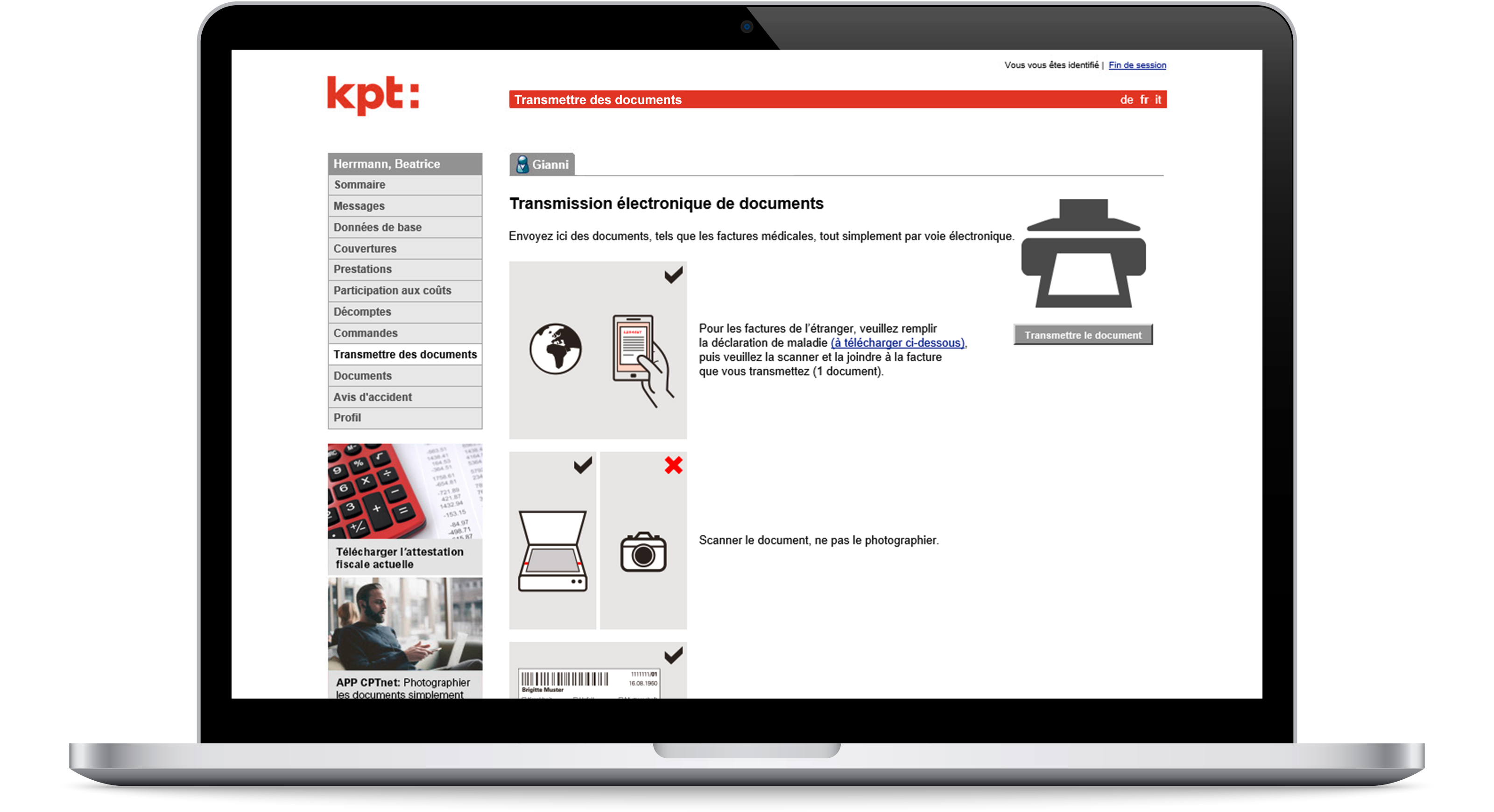 Vous avez un scanner et vous utilisez notre portail clients KPTnet? Alors transmettez vos documents, comme vos factures, justificatifs de remboursement ou virements, de manière simple et rapide en ligne.