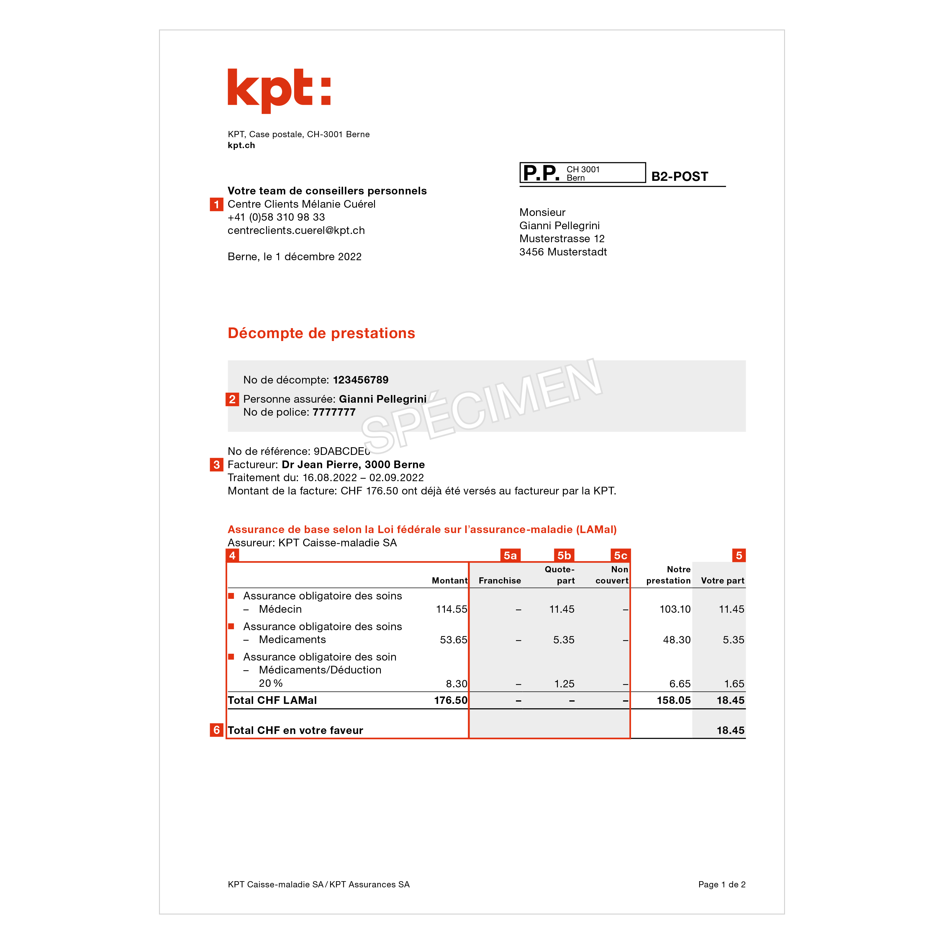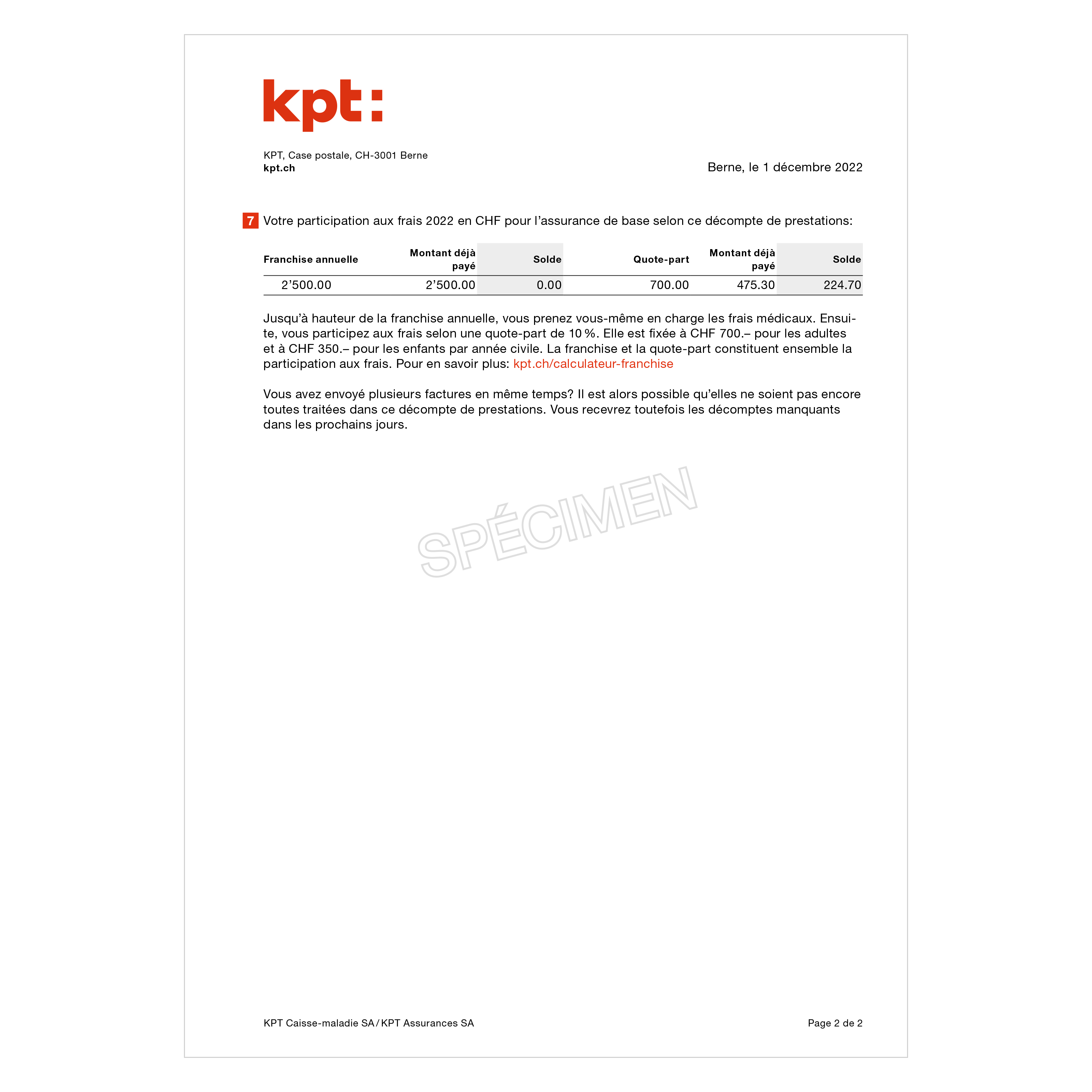 Si nous avons réglé la facture du fournisseur de prestations médicales, il est indiqué ici la part restant à votre charge. Ce montant vous est facturé. En revanche, si c’est vous qui avez réglé la facture du médecin ou de l’hôpital, c’est exactement l’inverse. Il est alors précisé ici la part à notre charge. Ce montant vous est remboursé. - État de votre participation aux coûts