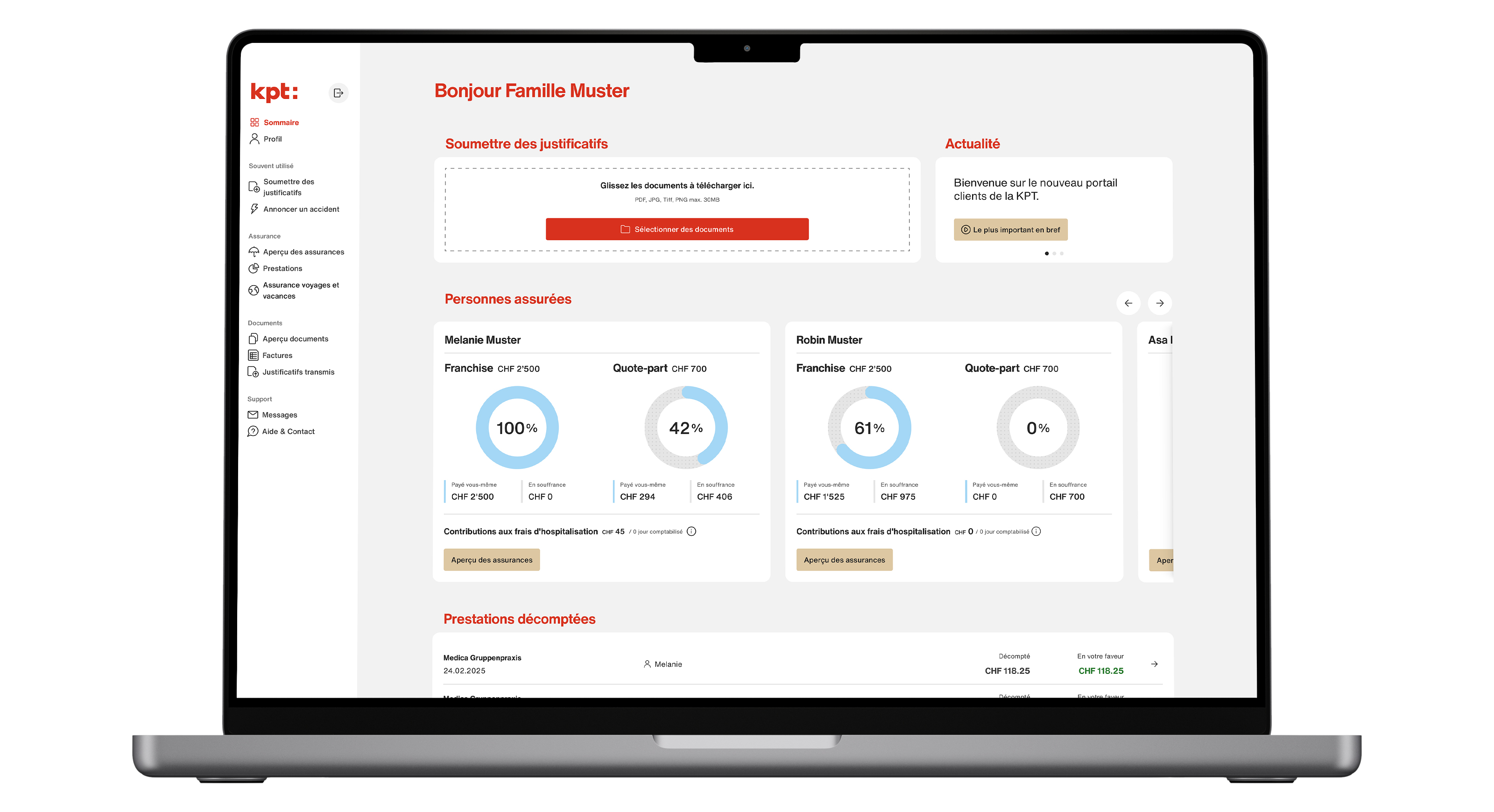 Vous trouverez les décomptes de prestations déjà traités dans le point de menu «Prestations». Cliquez sur un décompte et vous verrez en détail quels coûts sont pris en charge par la KPT et lesquels sont à votre charge.
