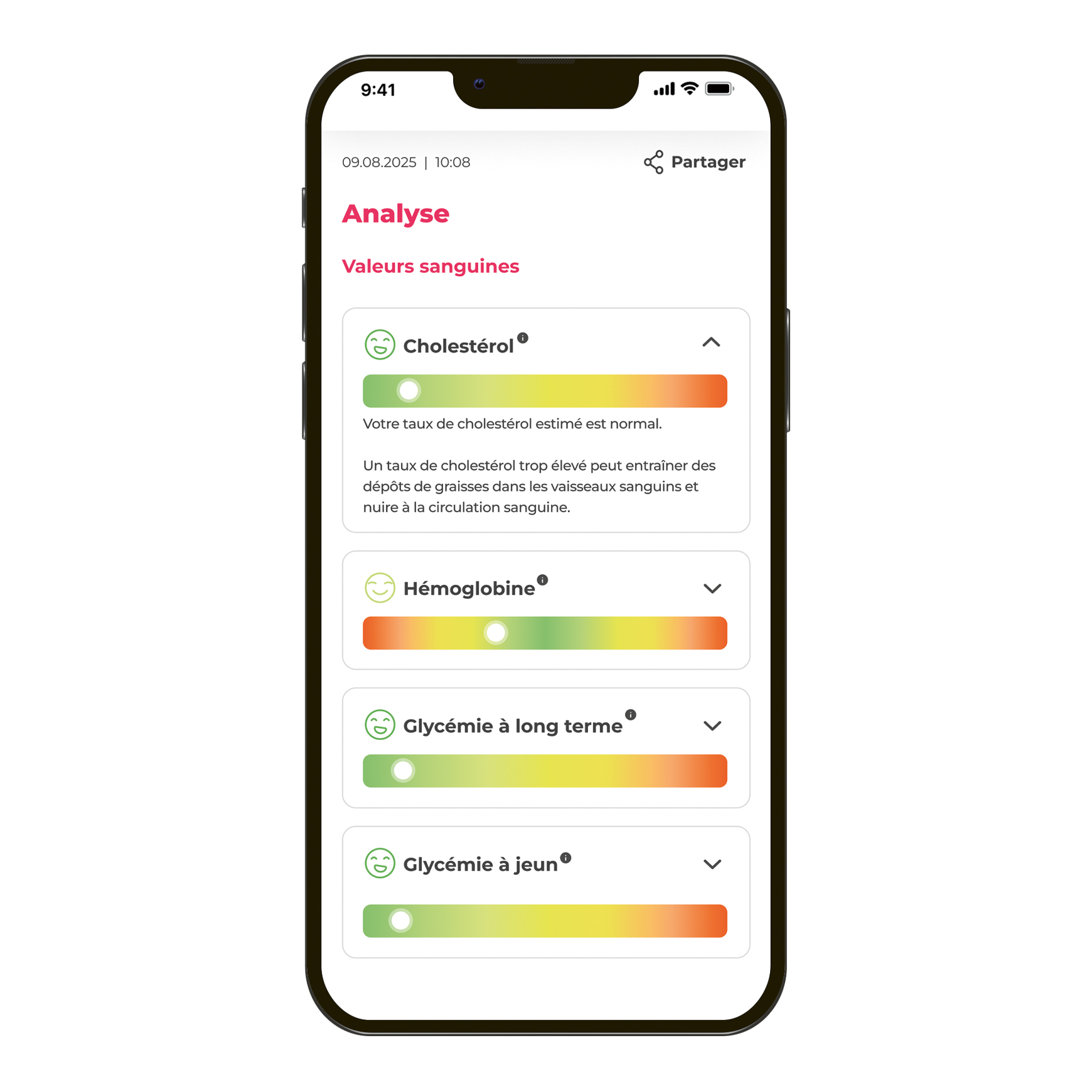 Vous ne vous sentez pas bien et désirez mesurer votre tension artérielle? Binah.ai vous donne une première indication en quelques secondes. En outre, vous pouvez également partager l’évaluation avec d’autres personnes directement depuis l’application. Par exemple, avec un professionnel de la santé qui pourra s’en servir pour compléter son évaluation de votre état de santé.