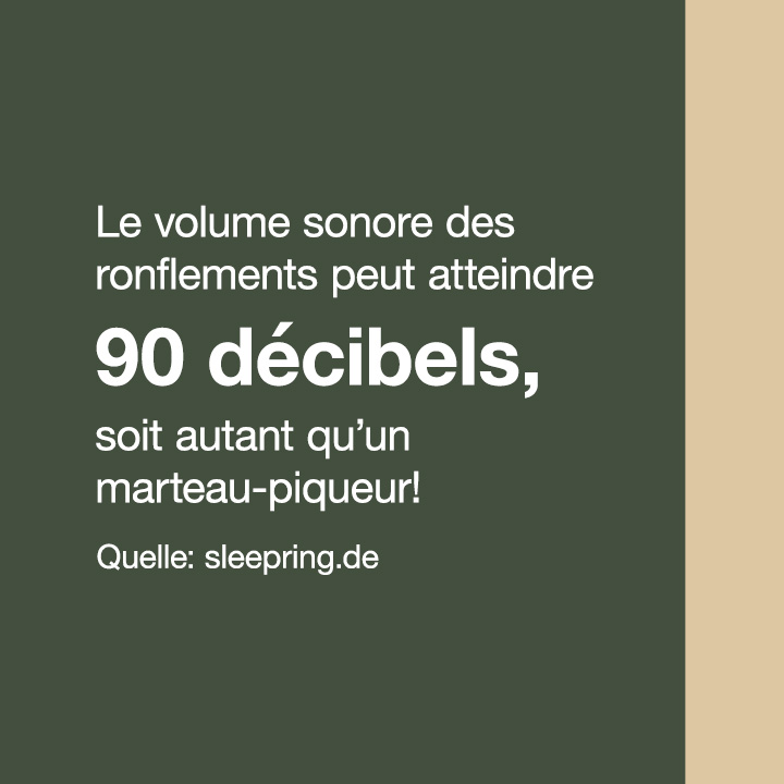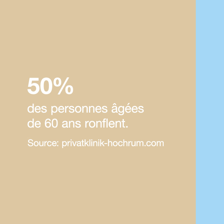 Toutes les personnes qui ronflent ne souffrent pas d’apnée du sommeil. Il est toutefois conseillé de consulter un médecin dès lors que des arrêts respiratoires et une fatigue ou une somnolence pendant la journée viennent s’ajouter à de forts ronflements. Selon des études, plus de 500 000 personnes en Suisse en souffrent, les hommes étant deux fois plus souvent touchés que les femmes (cela concerne plus de 12% de la population masculine). Étant donné que les enfants peuvent eux aussi présenter de tels symptômes, il est recommandé de consulter un médecin si ceux-ci émettent régulièrement de forts ronflements.