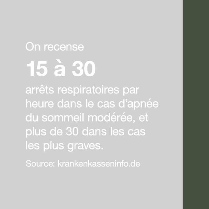 L’apnée du sommeil se caractérise par de nombreux arrêts respiratoires durant le sommeil. Ceux-ci peuvent durer aussi bien dix secondes que plus d’une minute. Ils se traduisent par un sommeil agité et superficiel, et peuvent avoir de vastes conséquences pour la santé. Le terme «syndrome d’apnée du sommeil» désigne l’ensemble de ces symptômes et leurs répercussions.