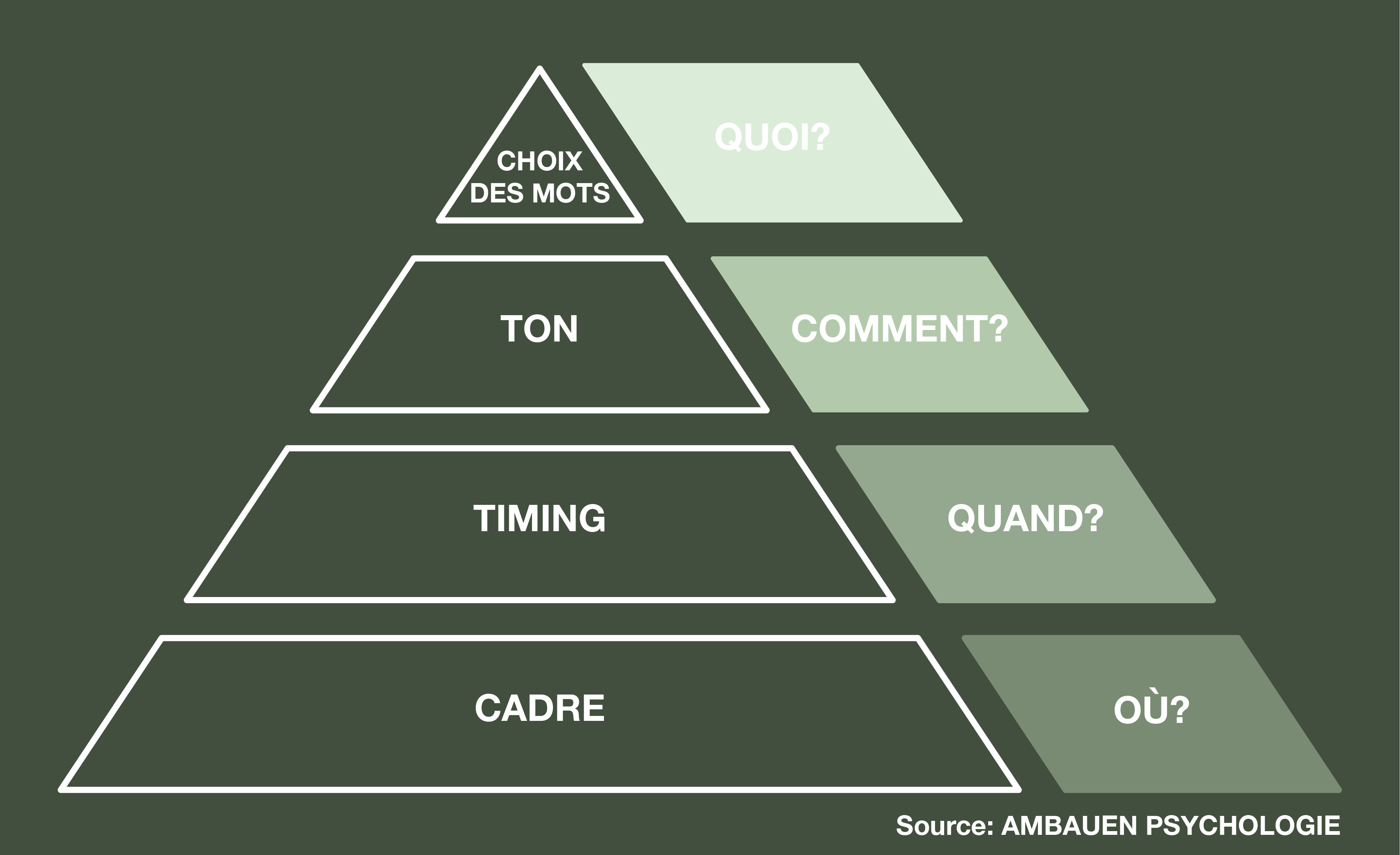 J’aime bien visualiser la pyramide de la communication que j’ai conçue avec mon mari. Il faut bien choisir le cadre, le timing, le ton et les mots. Ces aspects sont à prendre en compte par les deux partenaires, car ce que je dis n’est qu’une partie de la communication. Il vaut mieux éviter d’entamer une discussion de fond sur le foyer chez Ikea, par exemple: le cadre est mal choisi. On peut se demander si le meilleur moment pour avoir une conversation sur son couple est le vendredi soir, et pas plutôt le dimanche matin en toute tranquillité. Sur un ton agressif, même les mots les plus justes ne sont d’aucune utilité.