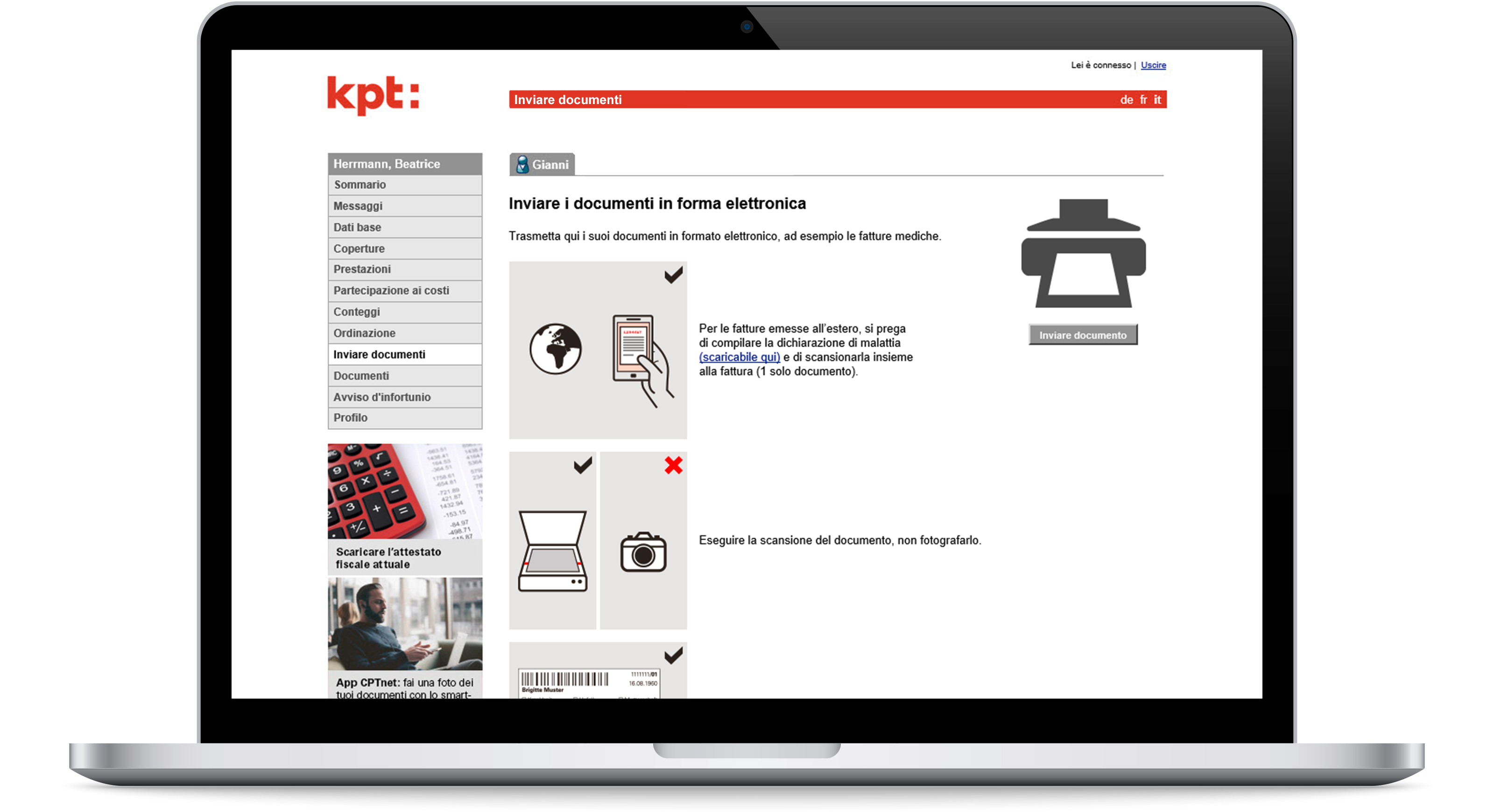 Avete uno scanner e usate il nostro portale clienti KPTnet? Allora scegliete l’invio online, rapido e semplicissimo, di documenti come fatture, giustificativi dei rimborsi, trasferimenti ecc.