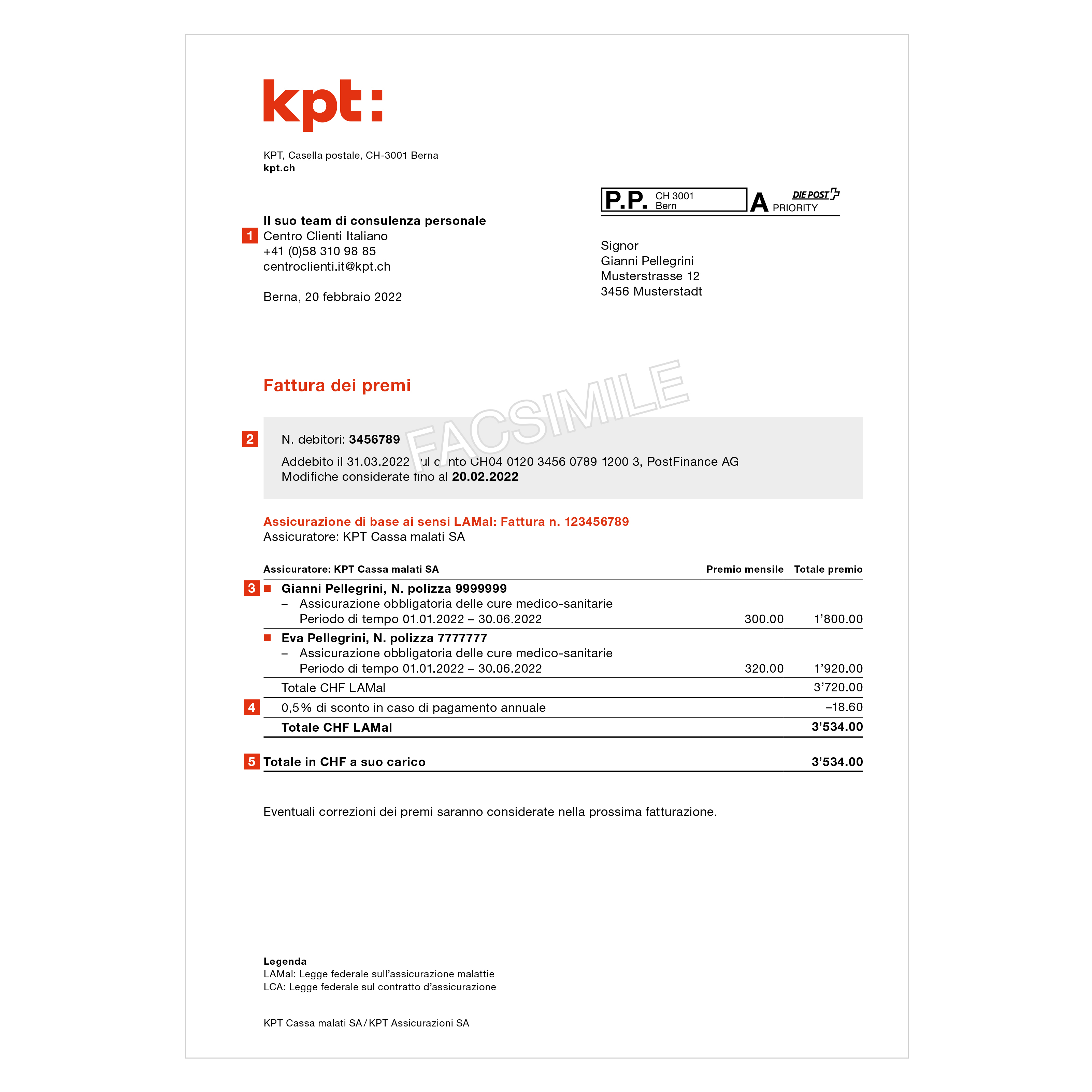L’importo del premio viene riportato separatamente per l’assicurazione di base e le assicurazioni complementari di ogni persona assicurata. Se avete associato allo stesso numero di famiglia diversi membri della vostra famiglia, ricevete una fattura cumulativa. Diversamente, tutte le persone assicurate con la KPT ricevono una fattura dei premi separata. -