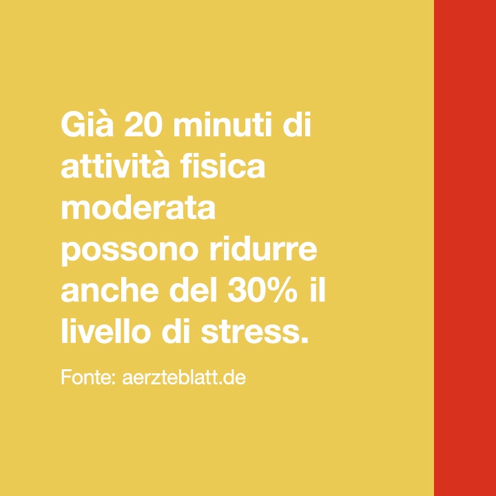 Particolarmente importante è una regolare attività fisica: lo sport aiuta a ridurre gli ormoni dello stress e a favorire la produzione di endorfine, responsabili del benessere. Anche un’alimentazione equilibrata e una rinuncia quasi totale di alimenti con un alto contenuto di zucchero e caffeina aiutano a ridurre lo stress. E, ovviamente, fare esercizi di rilassamento e dormire a sufficienza.