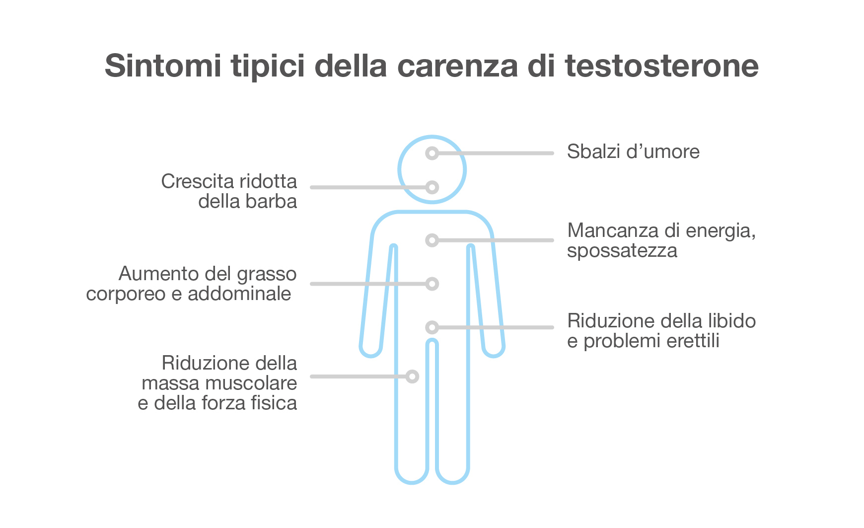Una carenza di testosterone non curata può avere conseguenze significative sulla salute. Tra queste ci sono ad es. la perdita di massa muscolare e di densità ossea, che aumentano il rischio di osteoporosi e fratture. Si accusano stanchezza, spossatezza e tendenze depressive, che compromettono la qualità della vita.
